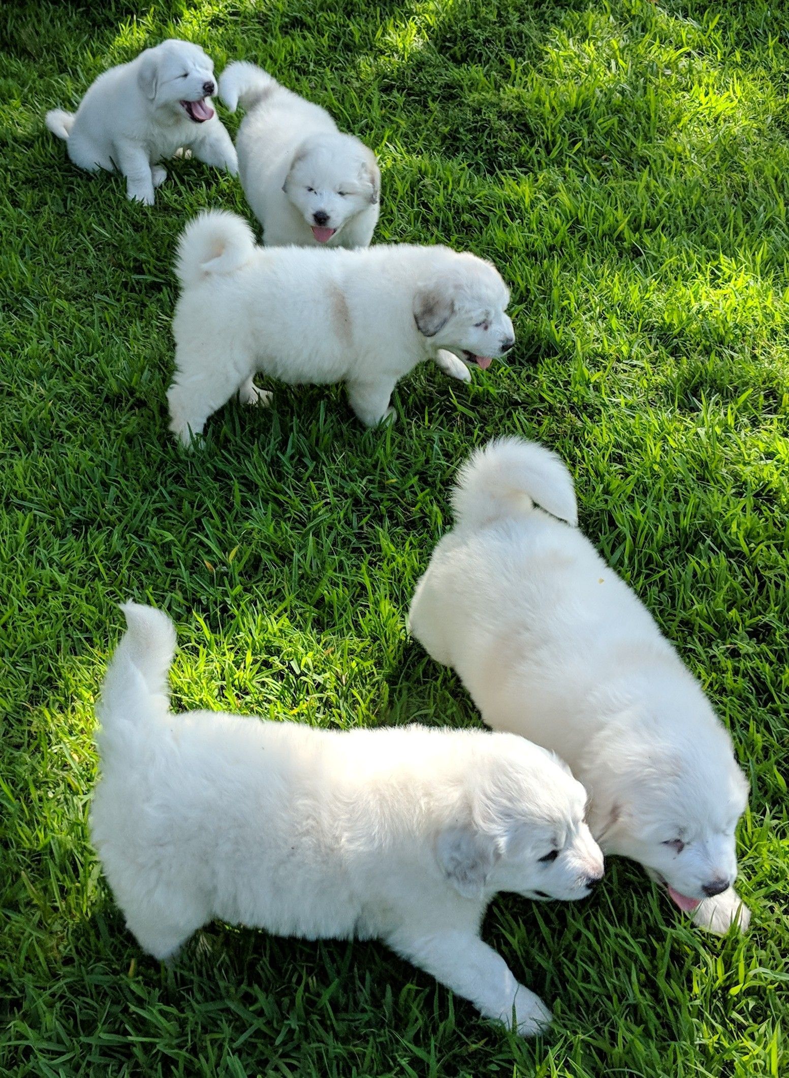 We have a litter of Great Pyrenees puppies that are available. They are currently weaning and eating solid food. They are ready to begin training for their new jobs. Call or email for more information.